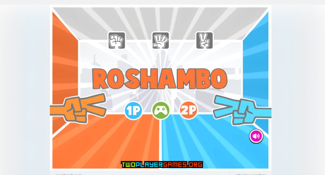 Roshambo trò chơi dựa theo lượt vui nhộn. Roshambo là một trò chơi oẳn tù tì. Chúng ta đều biết luật chơi oẳn tù tì rồi đúng không. Chúng tôi có sẵn trò chơi 1 người chơi và 2 người chơi. Chọn 1 người chơi nếu bạn muốn chơi với máy tính và nếu bạn muốn chơi với bạn bè của mình, bạn có thể chọn 2 người chơi. Cố gắng dự đoán các bước di chuyển của bạn bè hoặc máy tính của bạn. Người nào đạt được 3 điểm trước, người đó sẽ thắng trò chơi. Chuẩn bị chiến lược của bạn để đánh bại đối thủ của bạn. Đoán hành động của đối thủ và lừa họ đưa ra quyết định sai lầm và đánh lừa họ. Hãy thử trò chơi cổ điển này ngay bây giờ trên y8 và thách thức bạn bè của bạn.