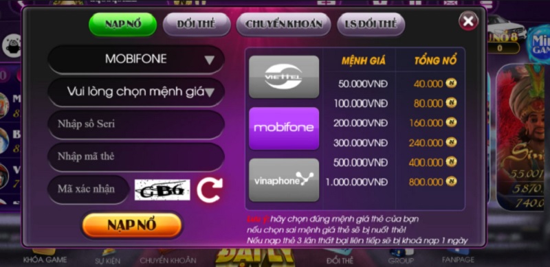 - Đối với hình thức thẻ cào người chơi cần chọn mệnh giá và tiến hành đổi thẻ. Cổng game cho phép người chơi rút tiền đổi thẻ không giới hạn về số lần và số tiền rút.