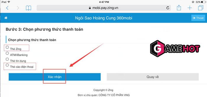 Bước 1: Đâu tiền, bạn hãy đăng nhập vào trang web https://pay.zing.vn/mobile/g/360mobi/ và chọn game mình cần nạp là ngôi sao hoàng cung.
