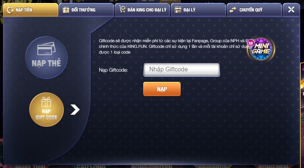 Tại nhà cái Kingfun, anh em có thể nạp tiền theo hai cách, đó là nạp thẻ và nạp giftcode.