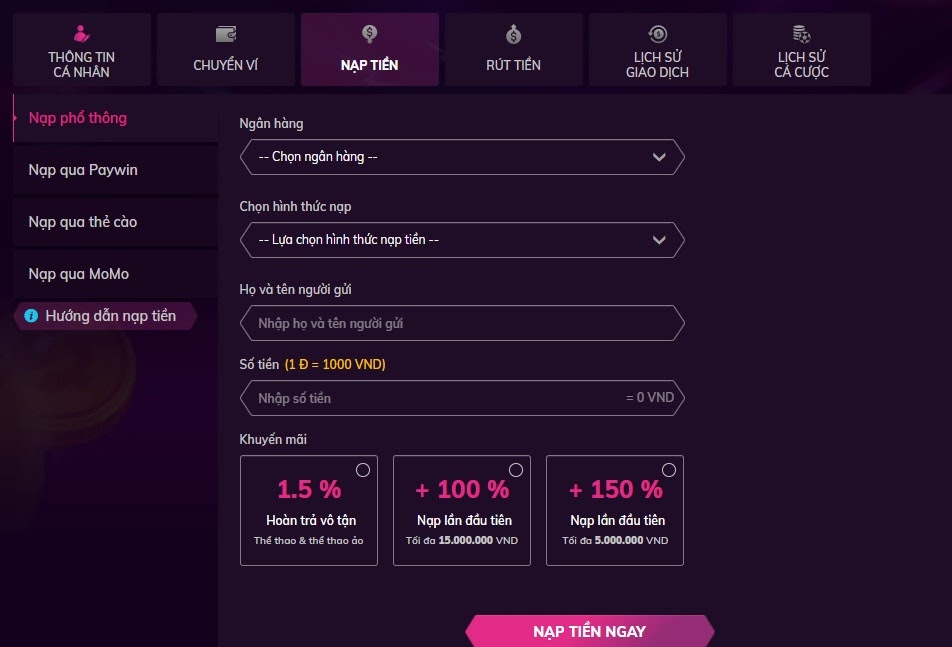 Nhà cái Nbet hỗ trợ anh em thực hiện nạp tiền qua các phương thức sau, gồm: Nạp phổ thông, nạp qua paywin, nạp qua thẻ cào và nạp qua Momo.