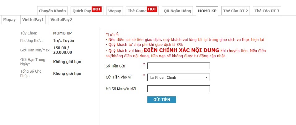 Đây cũng là một phương pháp giao dịch trực tuyến tiện lợi và nhanh chóng. Anh em sẽ phải tự chịu phí khi giao dịch là 3%. Anh em cần điền chính xác nội dung khi chuyển tiền để tránh những sự cố đáng tiếc khi giao dịch.