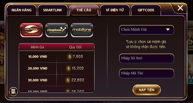 Nạp tiền qua thẻ cào là phương thức giao dịch tiện lợi và nhanh chóng mà nhiều người thường hay sử dụng. Với phương pháp nạp tiền này, Nhất vip hỗ trợ anh em nạp qua các nhà mạng bao gồm: Viettel, Vinaphone và Mobiphone.