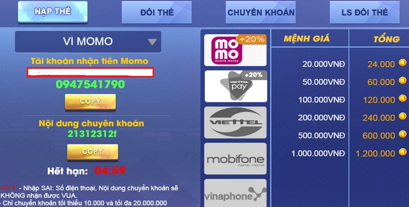- Nạp tiền bằng thẻ điện thoại: Người chơi sẽ chọn thẻ nhà mạng bạn muốn trong 3 loại Vinaphone, Viettel, Mobifone để tiến hành nạp. Trong đó người chơi chọn mệnh giá, điền số seri và mã thẻ, mã xác nhận rồi xác nhận hoàn thành nạp tiền.